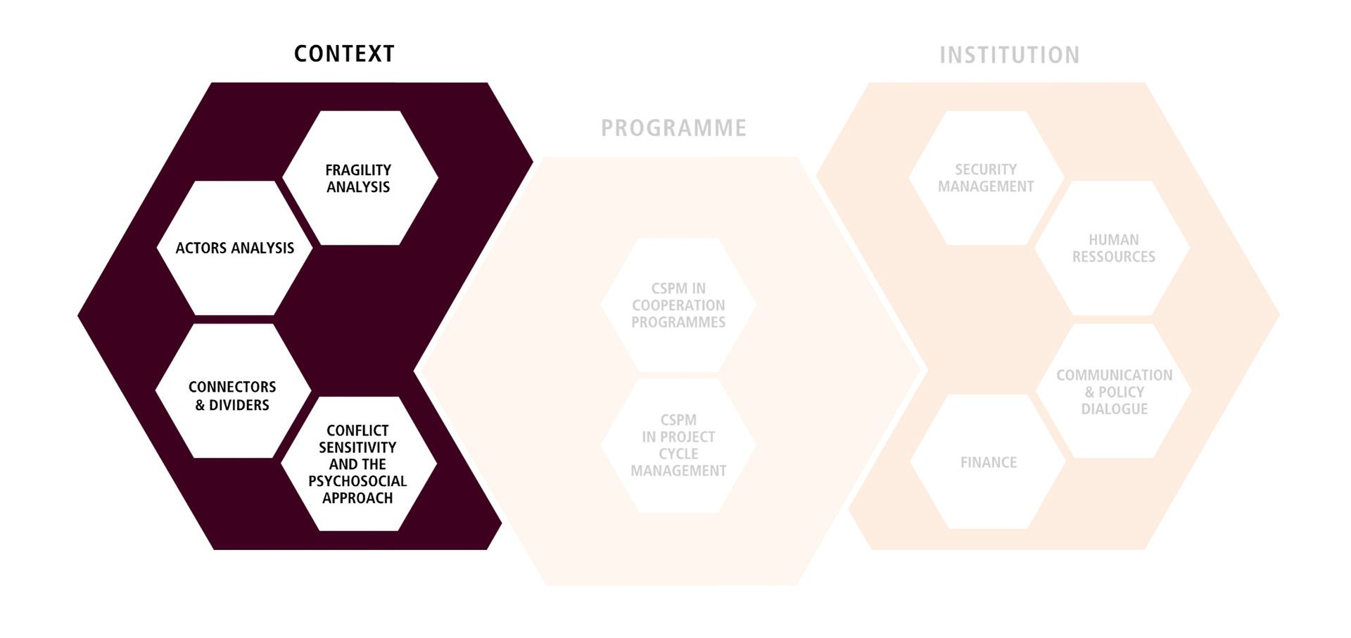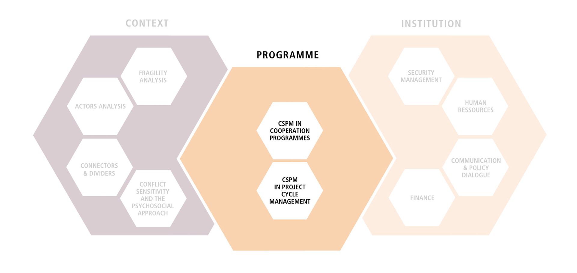 Our CSPM toolbox is divided into four sections: First, there is a general introduction to the topic, followed by the three management spheres: context, programme and institution. If you are looking for the French versions of these tools, visit our French page dedicated to CSPM.